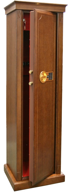 — Внутренняя отделка – эффектный красный бархат, успешно оберегающий оружие от царапин. Снаружи – декоративная отделка натуральным деревом и шпоном дуба.