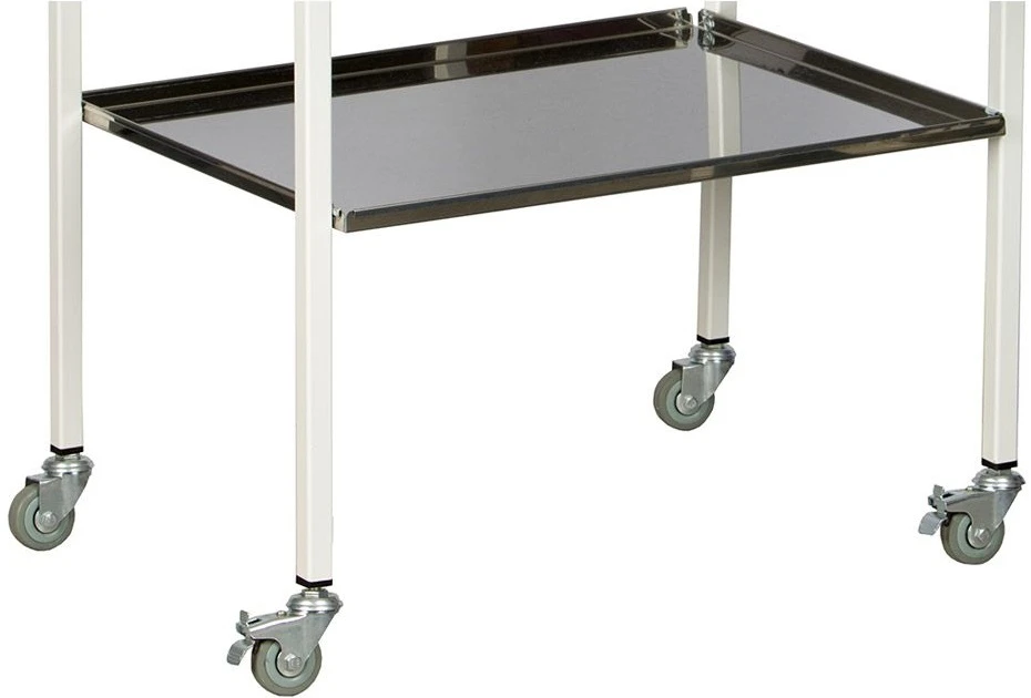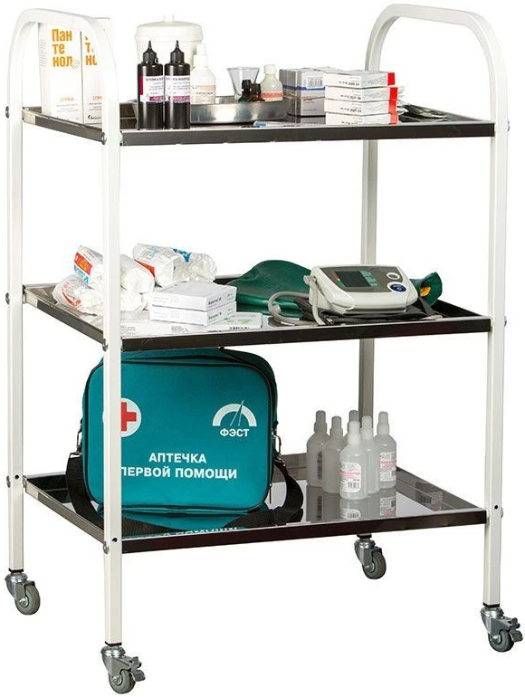 - Полки образуют три уровня хранения. Выполнены из высокопрочной нержавеющей стали 0.8 мм, устойчивой к возникновению трещин и сколов, а также к обработке дезинфицирующими средствами.
